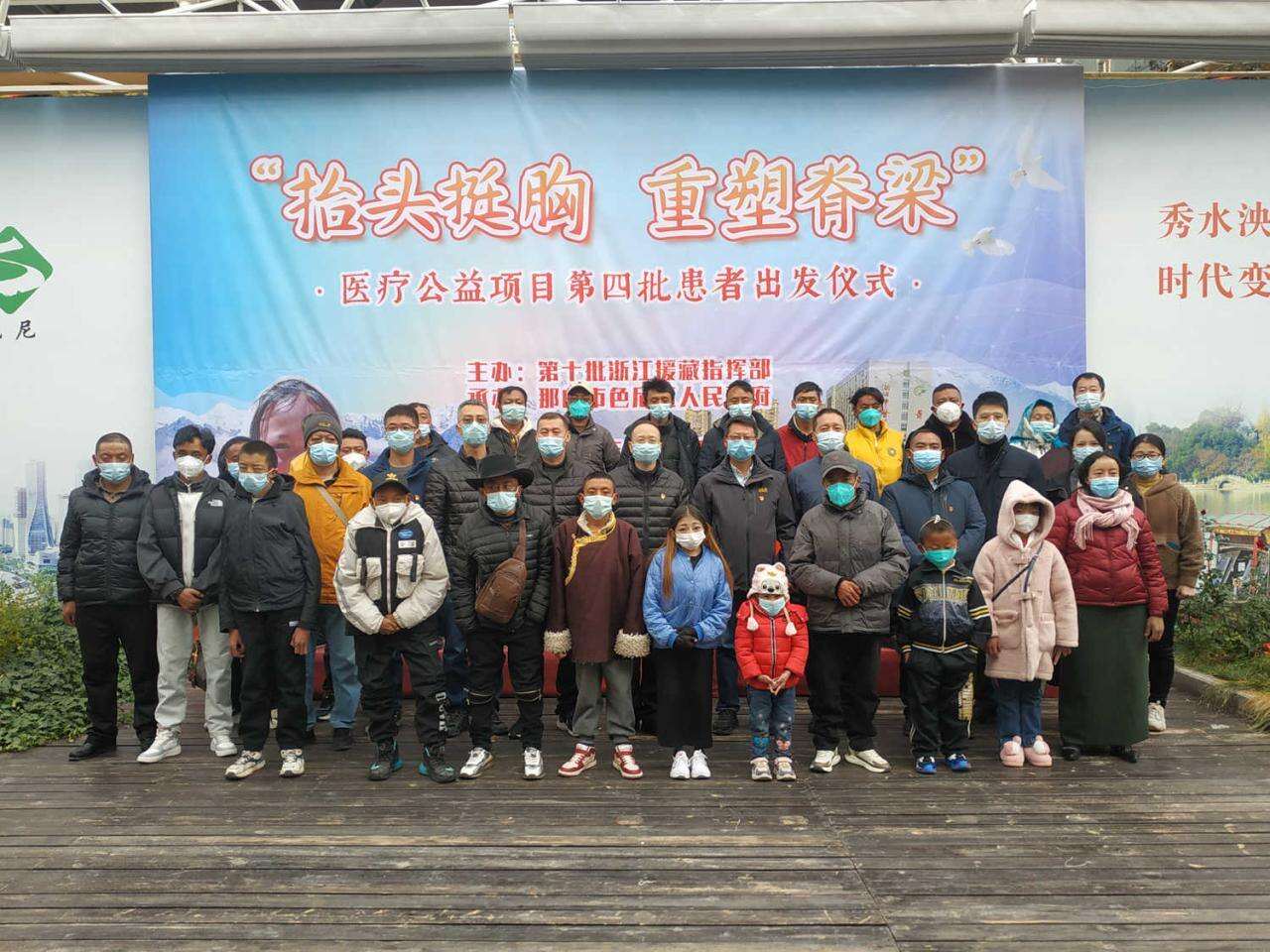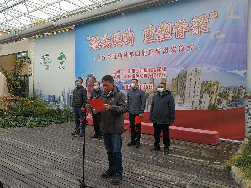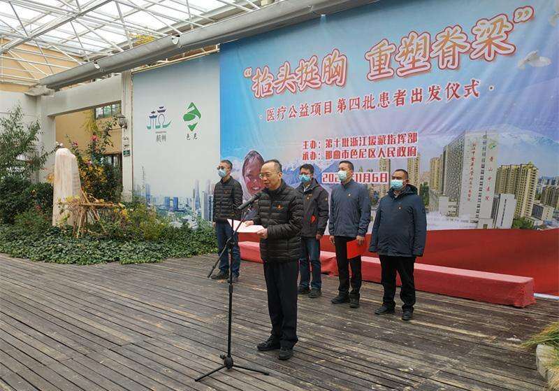 浙江在线11月6日讯 11月6日下午,“抬头挺胸 重塑脊梁”医疗公益项目第四批患者出发仪式在杭嘉援藏公寓举行。浙江省援藏指挥部党委书记、指挥长董旭斌,那曲市政府党组成员、副市长、色尼区委书记李东,浙江省援藏指挥部副指挥长、色尼区委常务副书记李浙峰以及浙江援藏医疗业务组组长洪禹出席仪式,第四批患者、家属和第三批康复患者代表等40余人参加。