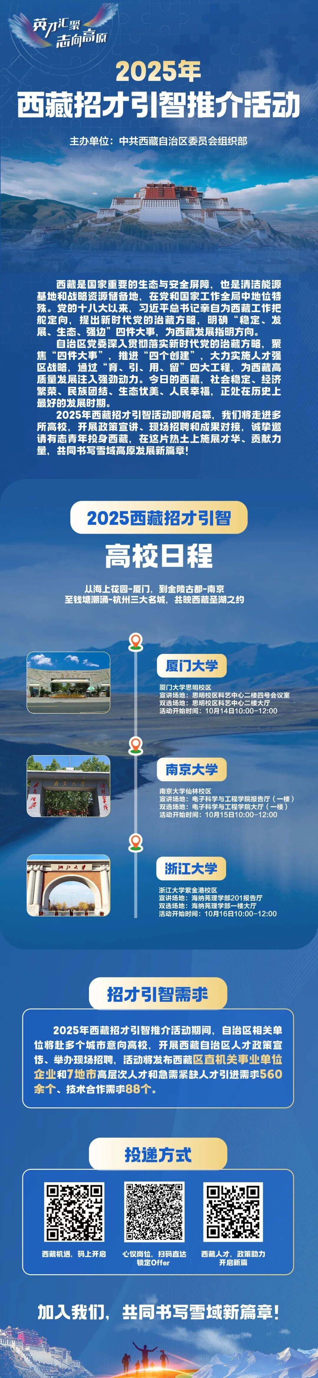 浙江在线10月15日讯 “英才汇聚 志向高原”2025年西藏招才引智推介活动(浙江大学站)将于10月16日10:00在浙江大学(紫金港校区)海纳苑理学部201报告厅举办。本科毕业生年薪优厚,另根据政策有带薪年休假超50天(具体请扫下方二维码查询招聘公告和人才政策)。逐梦高原,诚邀心怀理想的你,赴一场与西藏的成长之约!